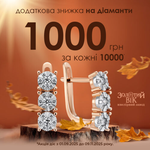 1000 грн додаткової знижки за кожні 10000 грн на прикраси з діамантами.