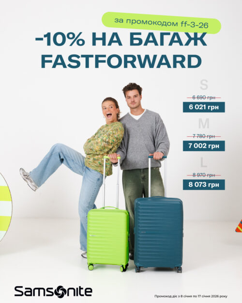 З 8.01.2026 по 17.01.2026 купуйте валізи FASTFORWARD в магазинах нашої мережі та онлайн зі знижкою -10% за промокодом ff-3-26.